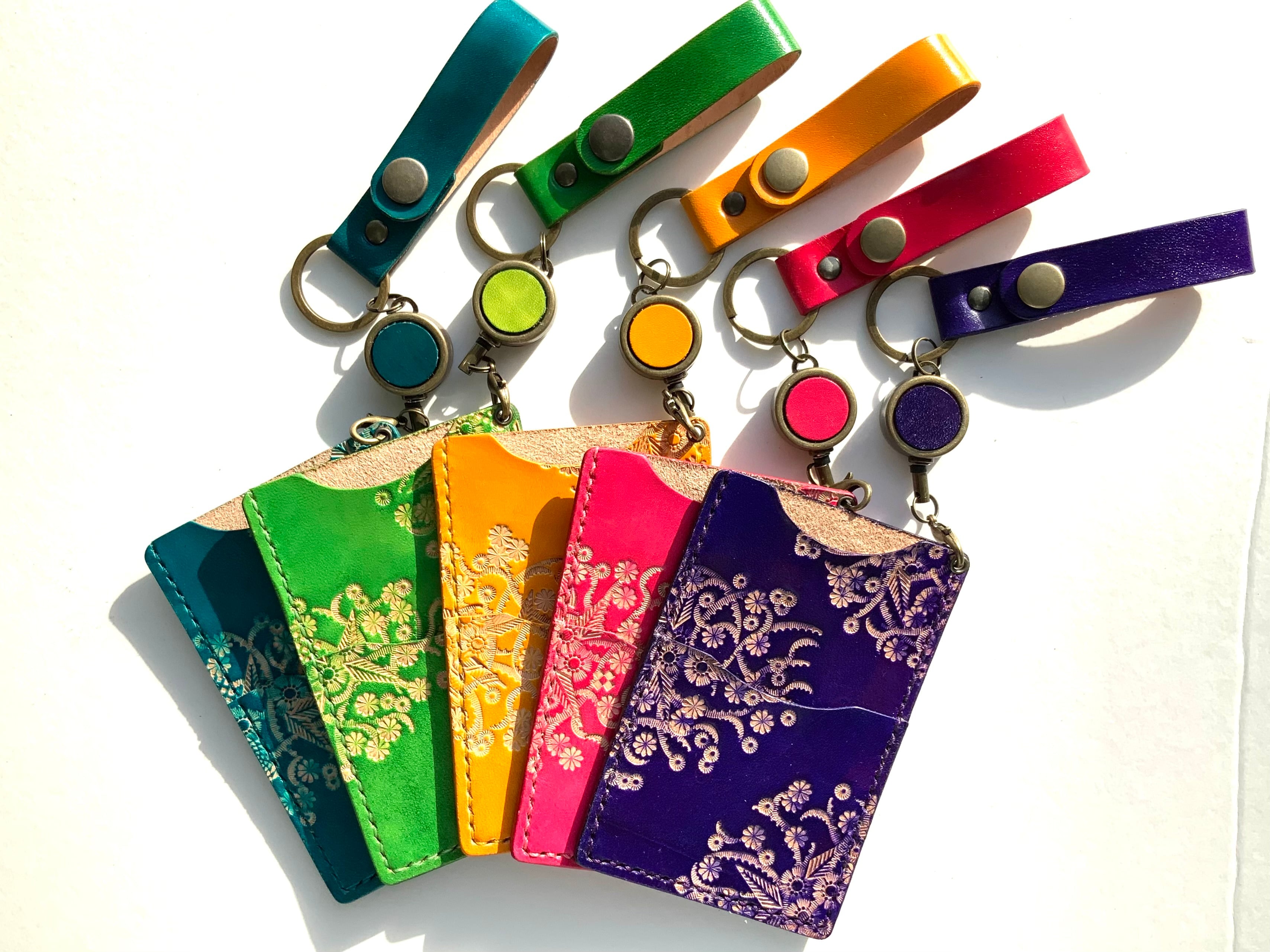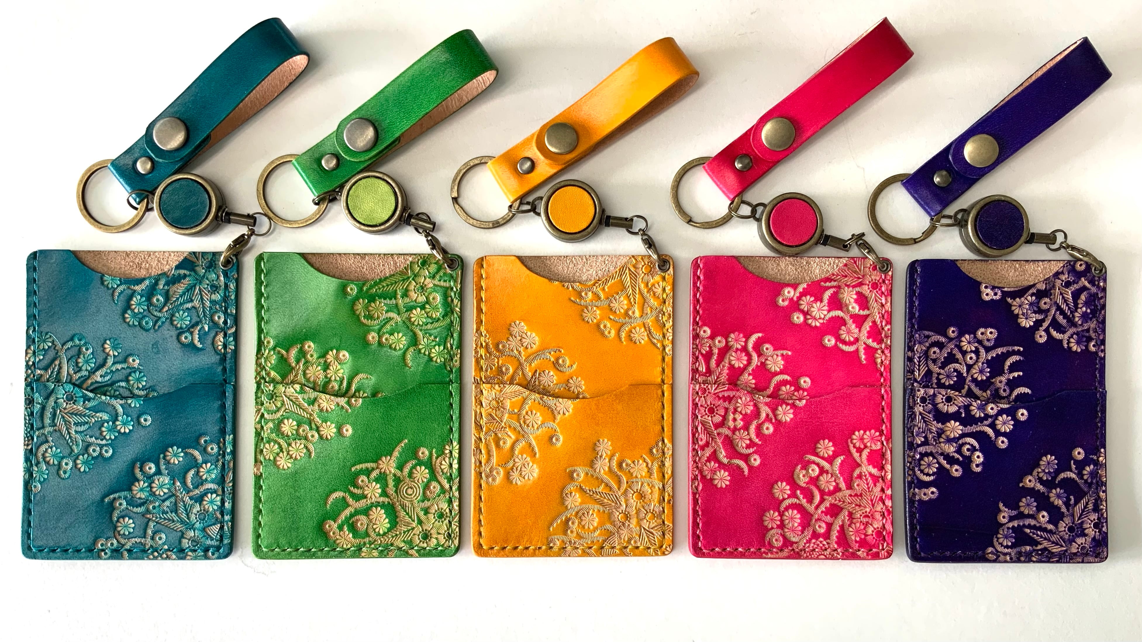 成牛ヌメ革にひとつひとつ刻印を施し,染料で染め鮮やかな色に仕上げています.